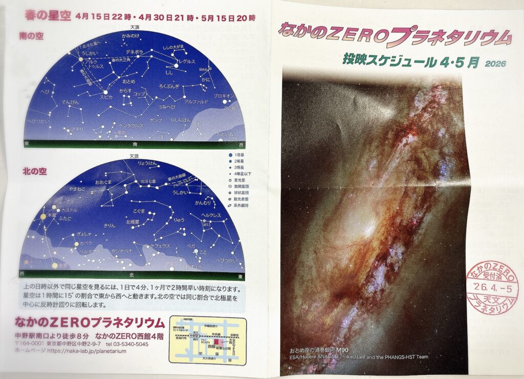 この日は「北極星をさがそう」 東京・中野の空が見られました。最初は街の明かりあり、その後、街の明かりを消しての星空が映されました。投影日の空が映されます。4月なので、最初は冬の星と春の星が半々ずつ見られ、時間を追って解説が進んでいきました。