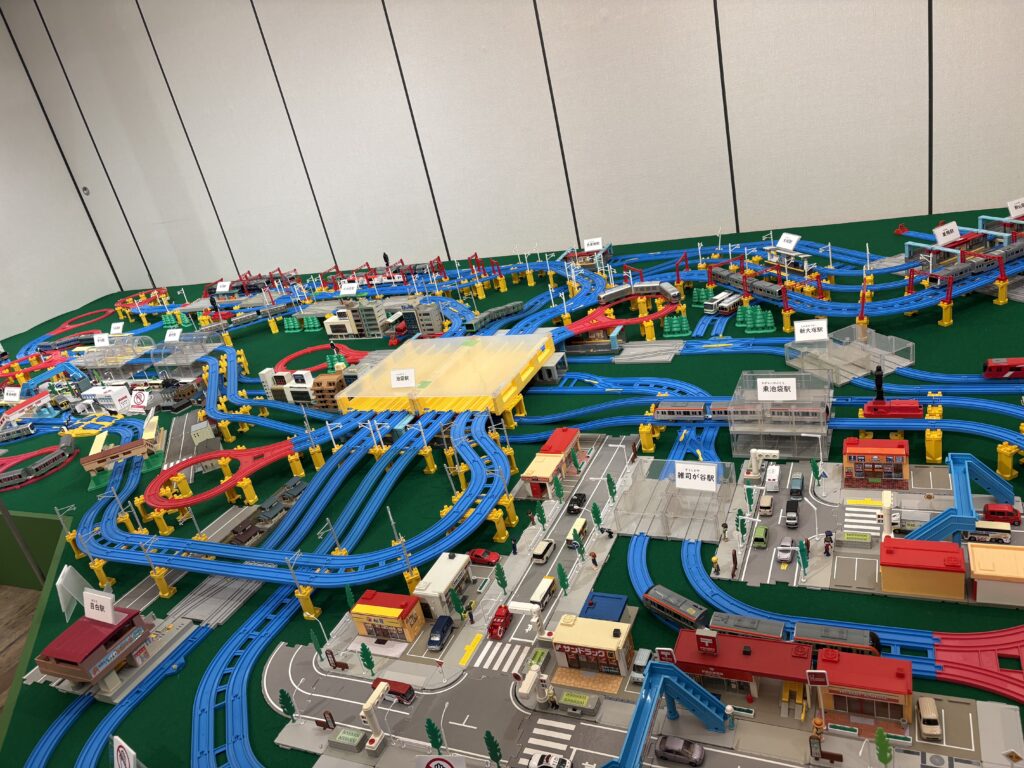 昔なつかしのおもちゃやプラレールがありました。昭和のおもちゃは実際に触って遊べました(コリント、あやとりなど)