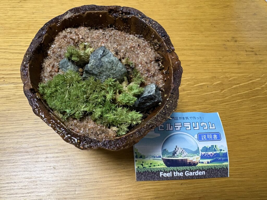 帰宅して早速テラリウムを作りました。カカオアイスの容器を持ち帰って再利用。良い感じです。水やりは月に1〜2回で良いようです。
